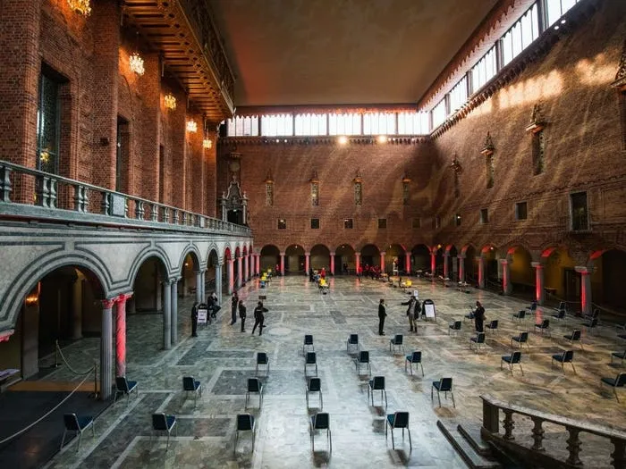 Зазвичай тут проводяться бенкети Нобелівської премії, але зараз тут проводиться вакцинація.