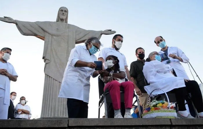 Моніка Калазанс, 54-річна медсестра, була першою людиною з Бразилії, яка отримала вакцину. І зробила вона це саме біля статуї.
