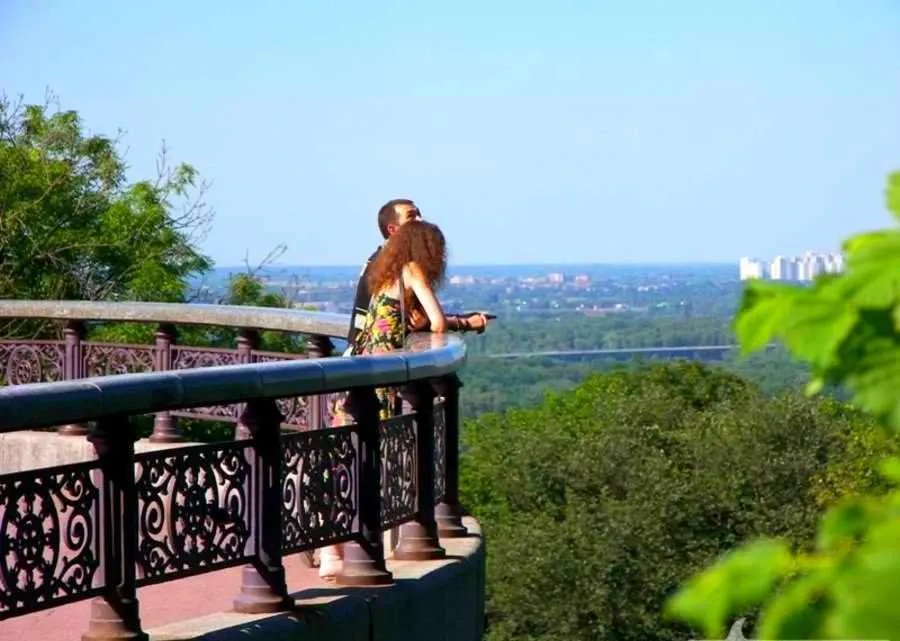 Один із найкращих майданчиків столиці розташований неподалік від розкішного Маріїнського палацу. З оглядового майданчика відкривається чудова панорама лівого берега. Тут сховалося ще одне улюблене всіма місце – Міст закоханих, який приведе вас в Хрещатий парк.