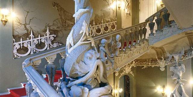 Інтер'єри та зовнішнє оформлення більше ніде не повторюються. Фасади прикрашені скульптурами на мисливську та міфологічну тематики – морські жителі, різні тварини, плазуни. Дивлячись на парапет даху, можна побачити нереїд, що тримають у руках тризуби, а замість волосся у них – фантастичні квіти та листя. Поруч сидять великі жаби та височіють хвости дельфінів. Свої крила широко розправляють орли, по колонах біжать ящірки. У стіни вмуровані голови антилоп, носорогів, крокодила та слонів, хоботи яких є водостоками.