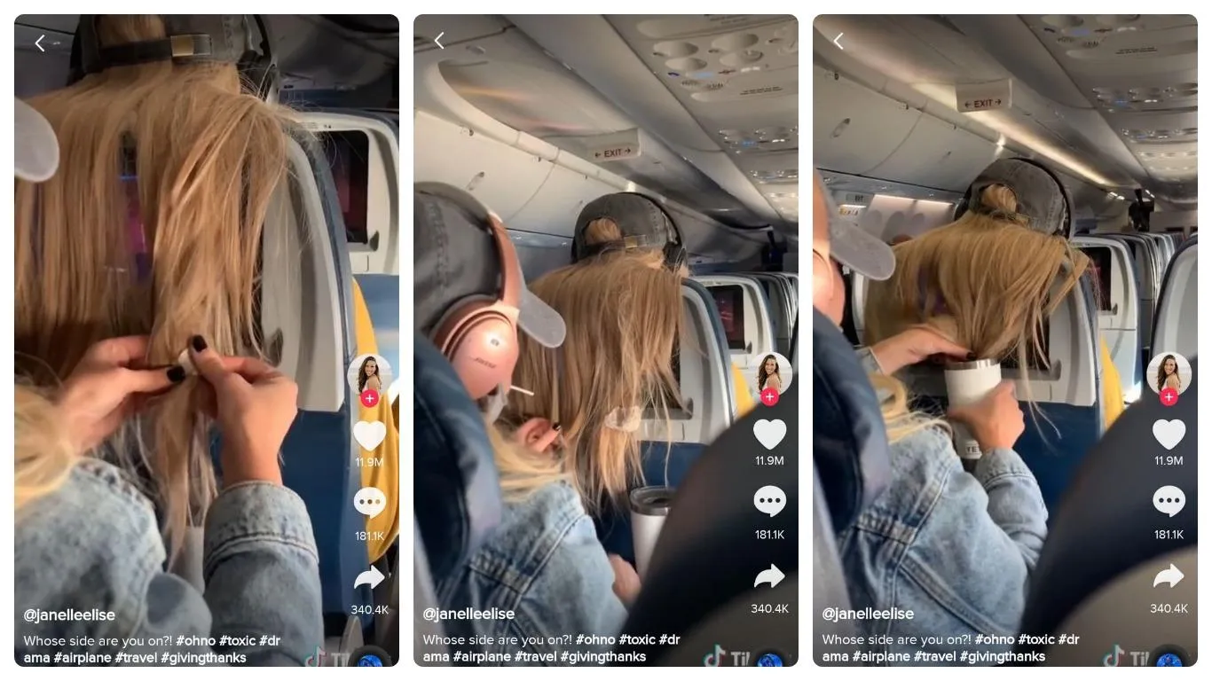 На одному із рейсів, білявка своїм довгим волоссям накрила спинку крісла й екран того, хто сидів позаду неї. Одна із користувачок TikTok опублікувала відео, в якому вирішила покарати сусідку й напхала жувальної гумки та цукерок їй у волосся. Крім того, деякі пасма були вмочені в каву, а цілі жмути взагалі відрізані.