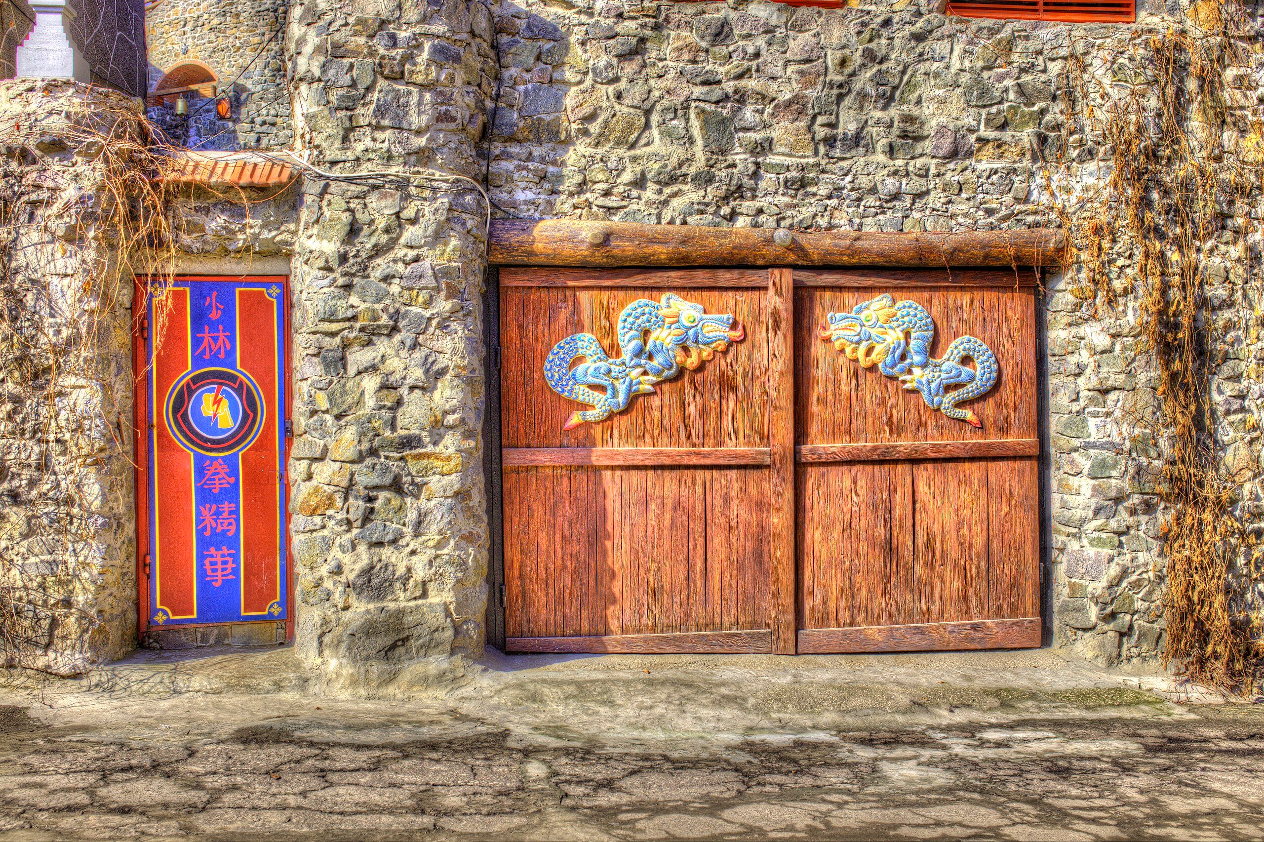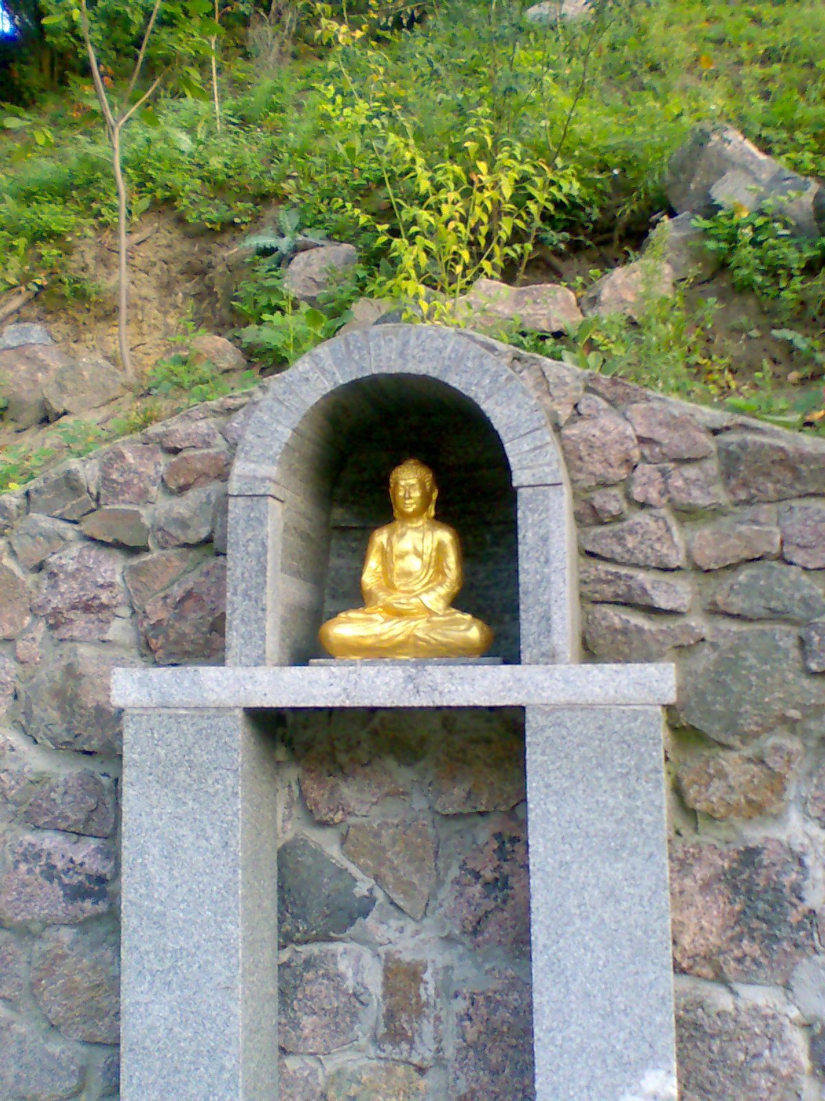 У дворі храму розташована вівтарна стіна з центральною статуєю Будди та двома воротами, що символізують два життєві шляхи: присвятити себе служінню іншим або зосередитися на власному вдосконаленні. На землі викладено зображення сонця з вісьмома променями, яке уособлює вісім канонів буддійського шляху: духовний орієнтир для тих, хто прагне знайти гармонію та внутрішній спокій.