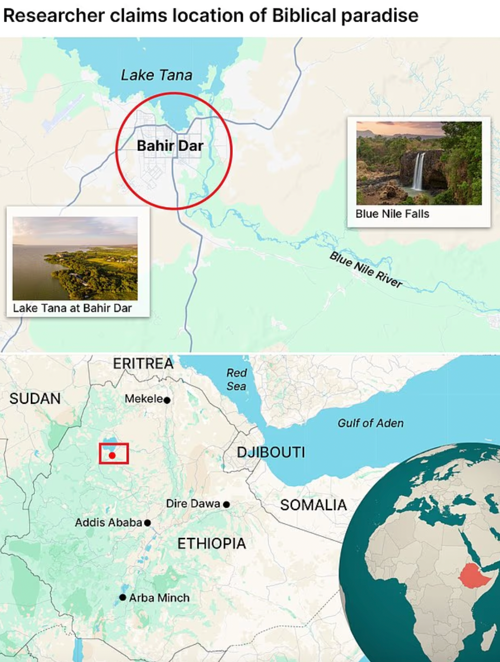 Нова теорія ставить під сумнів давнє переконання, що біблійний Едемський сад розташовувався на Близькому Сході. Дослідники припускають, що райське місце, можливо, насправді був в Ефіопії – біля озера Тана, витоку Блакитного Нілу.