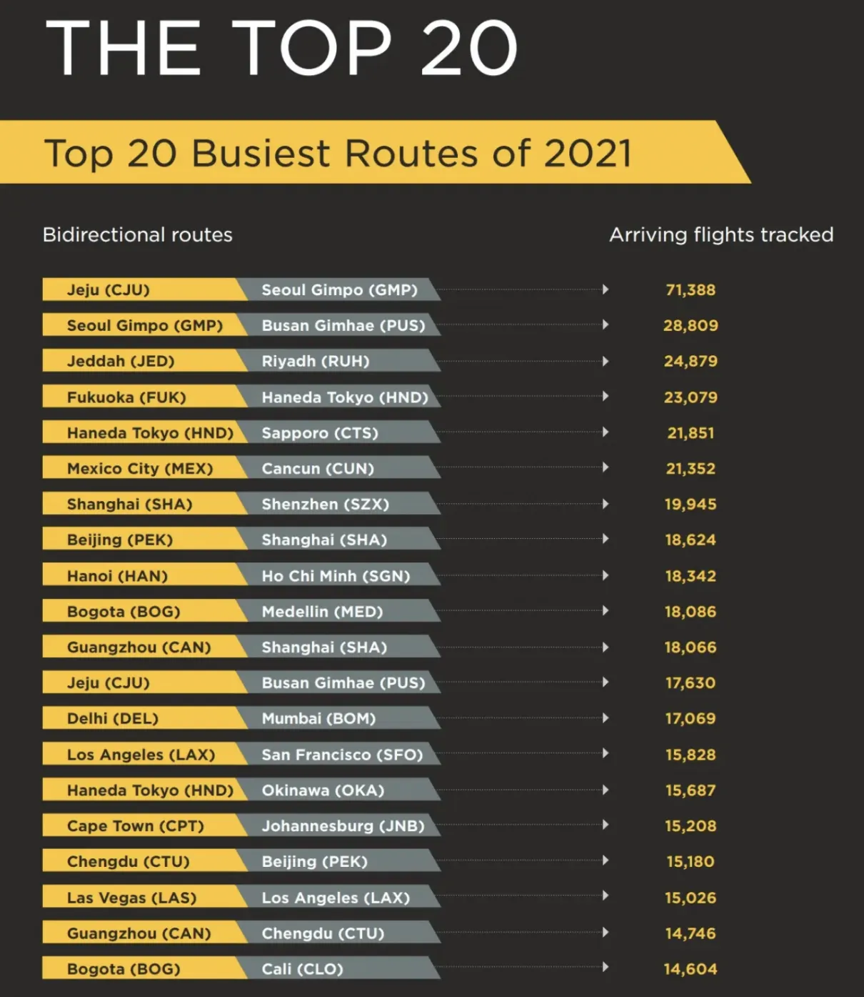 Дані Cirium показують найбільш заповнені маршрути за виконаними рейсами. Лідером став маршрут з острова Чеджу до Сеула (Південна Корея). За цим напрямком було виконано 71 388 рейсів.
