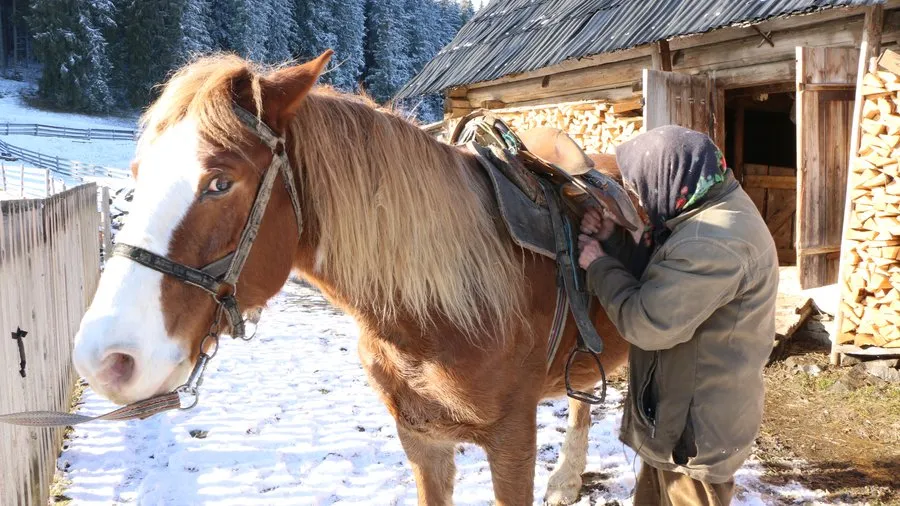 З гори до села жінка спускається з конем Лисом. Там вона заряджає мобільний телефон і купує продукти. Верхи вміє їздити з дитинства, і зараз це для неї не проблема.