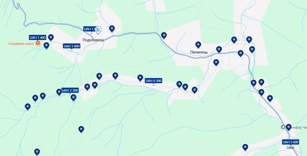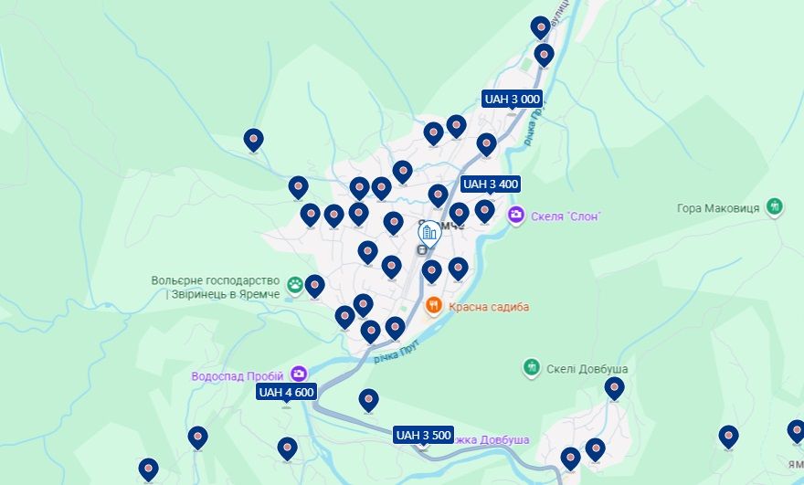 У Карпатах можна знайти бюджетне житло в селищах Пилипець та Подобовець, де ціни варіюються від 1 400 до 6 300 гривень, у Яремче з цінами від 3 000 до 4 600 гривень, у Славському з цінами від 800 до 7 500 гривень, а також у Верховині та Криворівні з цінами від 1 140 до 5 355 гривень.