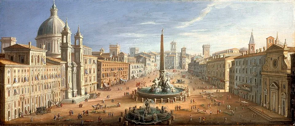 П'яцца Навона – це одна з найвражаючих барокових площ Риму, побудована на місці стадіону імператора Доміціана, який з'явився в 86 році нашої ери. Це був великий спортивний об'єкт для змагань з легкої атлетики, боротьби та кінних перегонів.