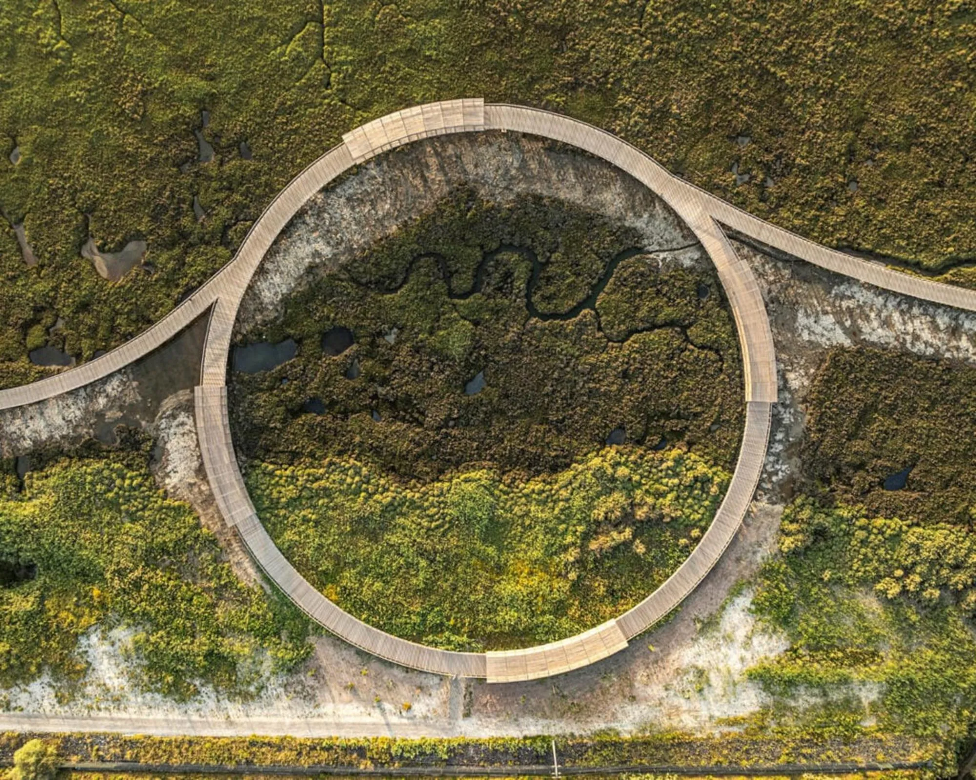 Щоб заохотити відвідувачів сповільнитися та насолодитися мультисенсорним досвідом, дизайнери створили круговий маршрут, а не лінійний, натхненний дренажними лініями, що звиваються крізь болото,