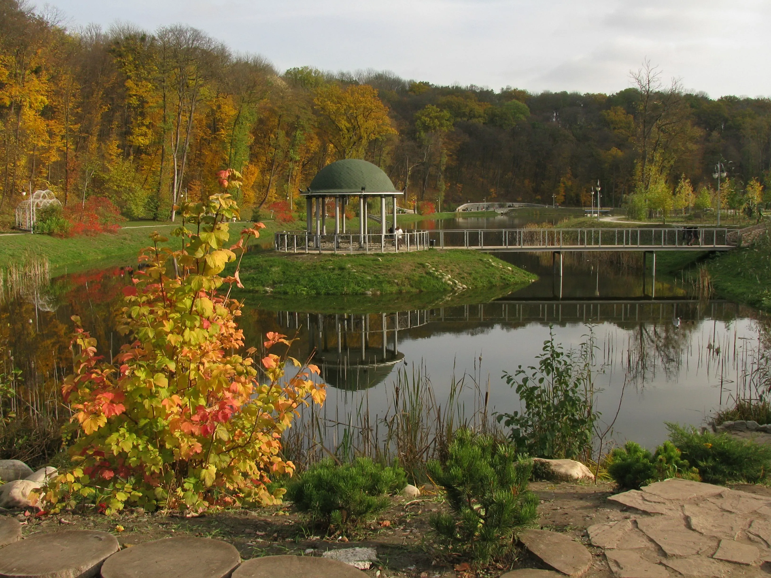 Парк Феофания находится на территории Голосеевского района, обладает большой зеленой зоной с огромными деревьями, прудами, фонтанами, беседками и духовными святынями.