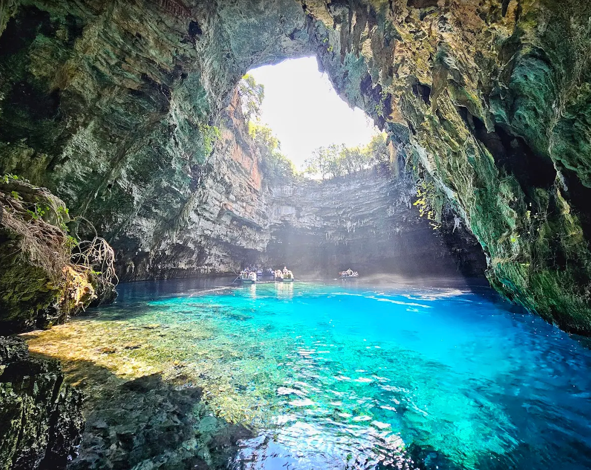 - На острове Кефалония в Греции расположено озеро Мелиссани, которое спрятано в пещере с обвалившейся крышей, что позволяет солнечным лучам освещать воду.