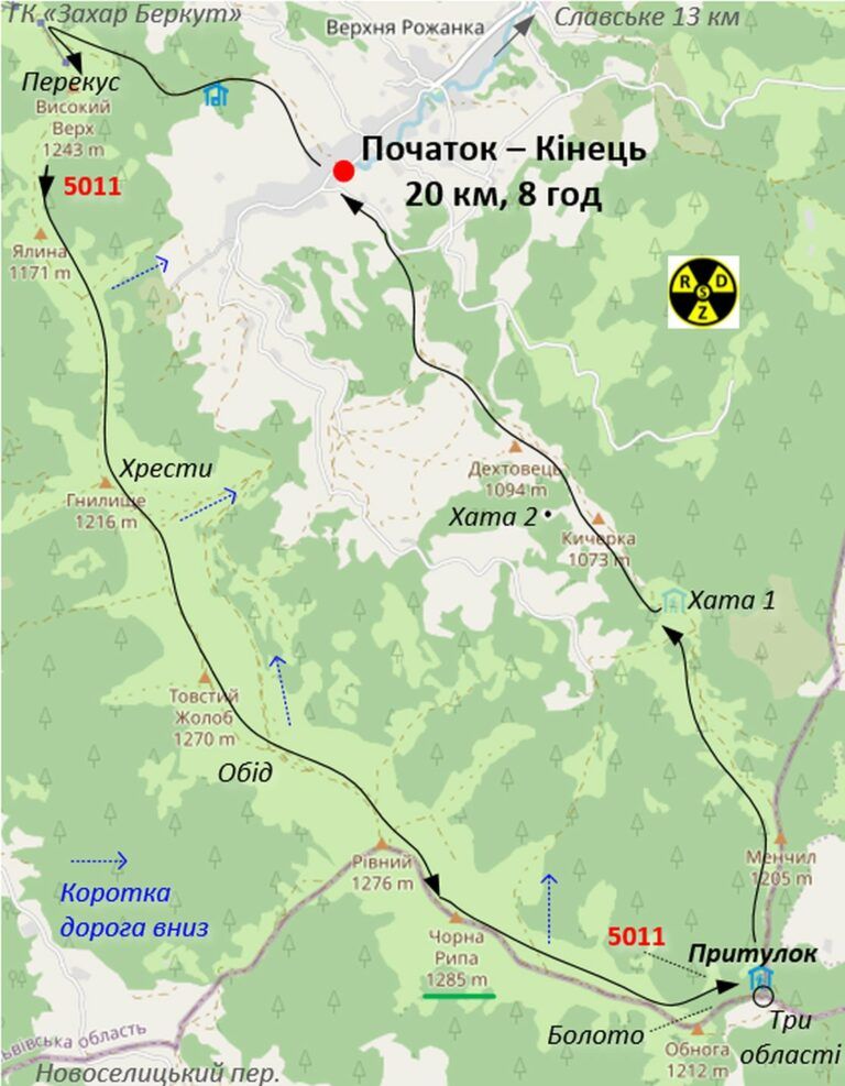 - Маршрут начинается в селе Верхняя Рожанка и включает гору Высокий Верх (1243 метры), урочище "Обноги" на границе трех областей, и заканчивается в селе после спуска с горы Дехтовец (1094 метры).