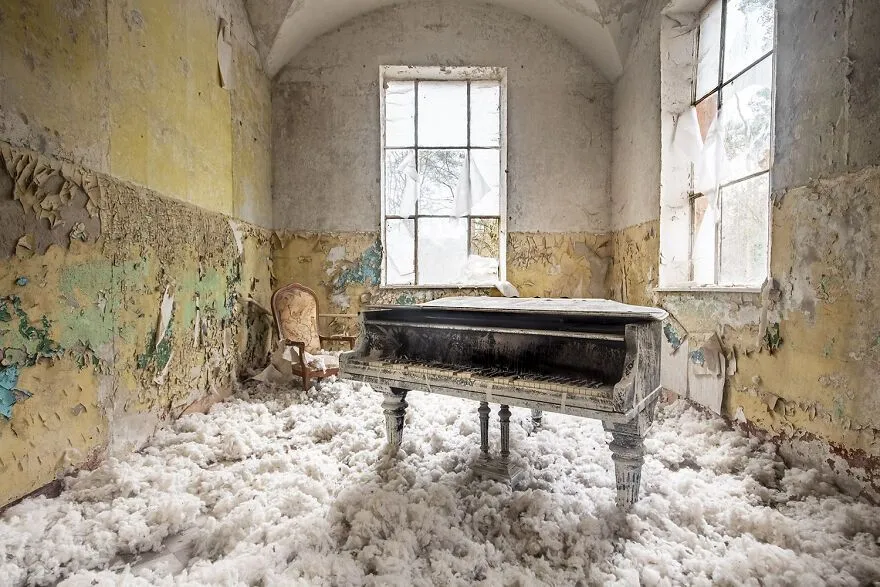 Фортепиано – сердце дома. А еще фортепиано тяжелые, поэтому их часто оставляют в заброшенных жилищах. Фотограф и пианист Ромен Тьери искренне убежден, что даже среди разрушенного пространства фортепиано способно сохранять свою силу.