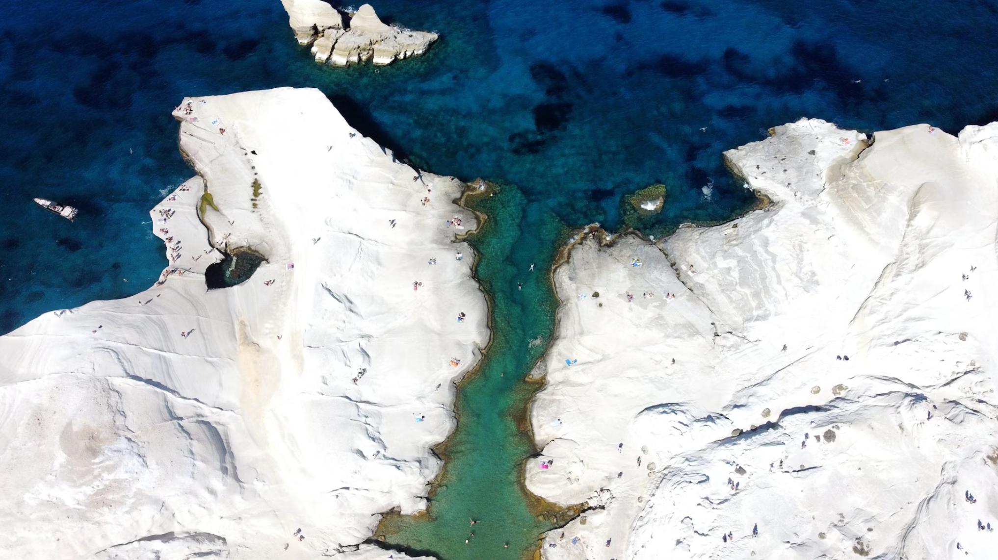 - остров Саракинико выделяется своими культовыми гладкими белыми вулканическими скалами, создающими сюрреалистический лунный пейзаж, который прекрасно контрастирует с бирюзовыми водами;