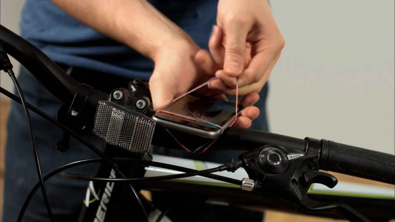 Сегодня, наверное, никто не выходит из дома без телефона. Чтобы закрепить его на руле велосипеда, рекомендуется для начала взять резиновый чехол и привязать его к рулю тонкой проволокой и затем вставить телефон на место. Или сложите две канцелярские резинки вместе и перекрутите их восьмеркой на руле, телефон положите сверху и закрепите резинками (сначала натяните верхнюю часть петли на телефон, а затем нижнюю просуньте под рулем и зацепите на другую часть гаджета).