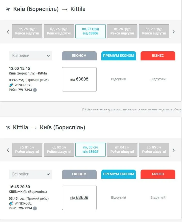 Билеты на рейс Киев – Киттиля уже можно забронировать. Доступные даты: 27 декабря, 3 и 10 января. В дороге придется провести почти 4 часа.