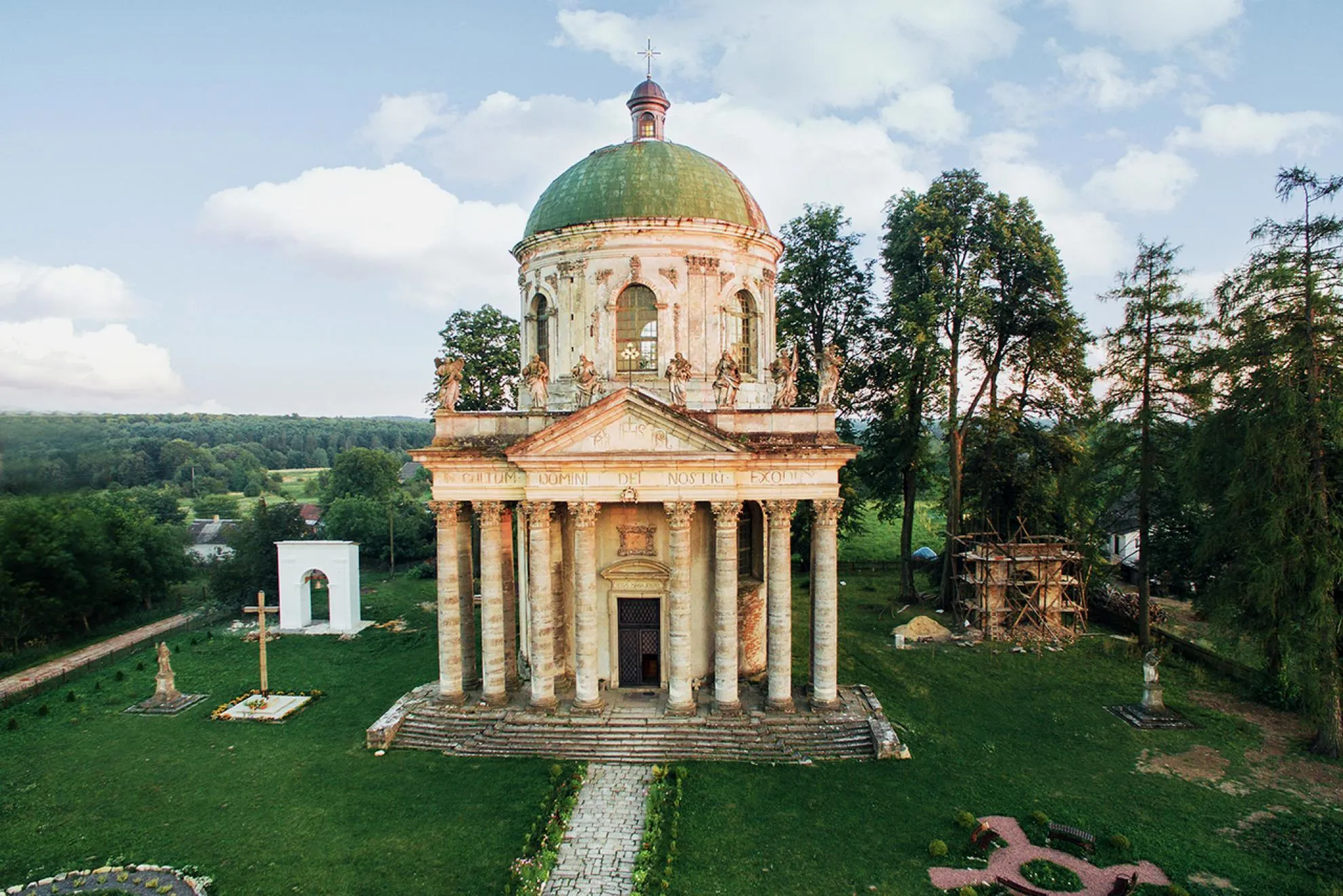 Длинная аллея из старых лип ведет к еще одному интересному элементу дворцового комплекса – костелу Воздвижения XVIII века. Украшенный восемью скульптурами святых, он был построен в стиле итальянского барокко.