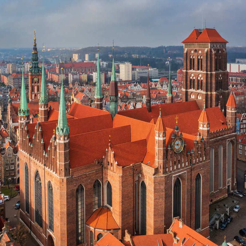 С высоты красной кирпичной базилики Святой Марии Гданьск кажется россыпью цветных деталей Lego, аккуратно расставленных рядами между мощеными улочками.