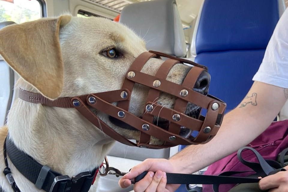 Большая собака в намордниках и на поводке / Фото UAnimals