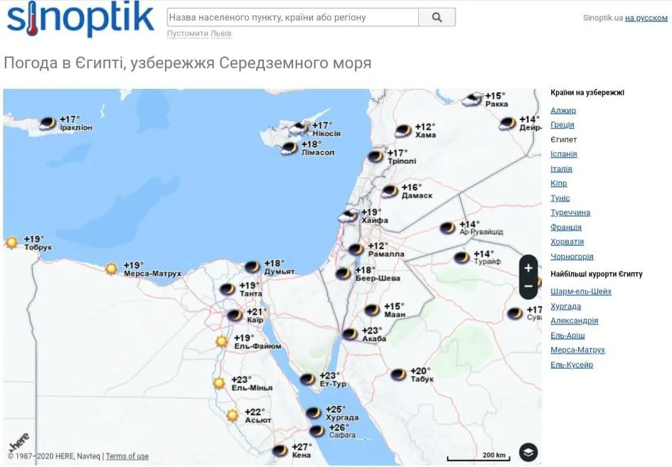 Погода в регионах Египта по состоянию на 10 декабря 2020 / Скриншот sinoptik.ua