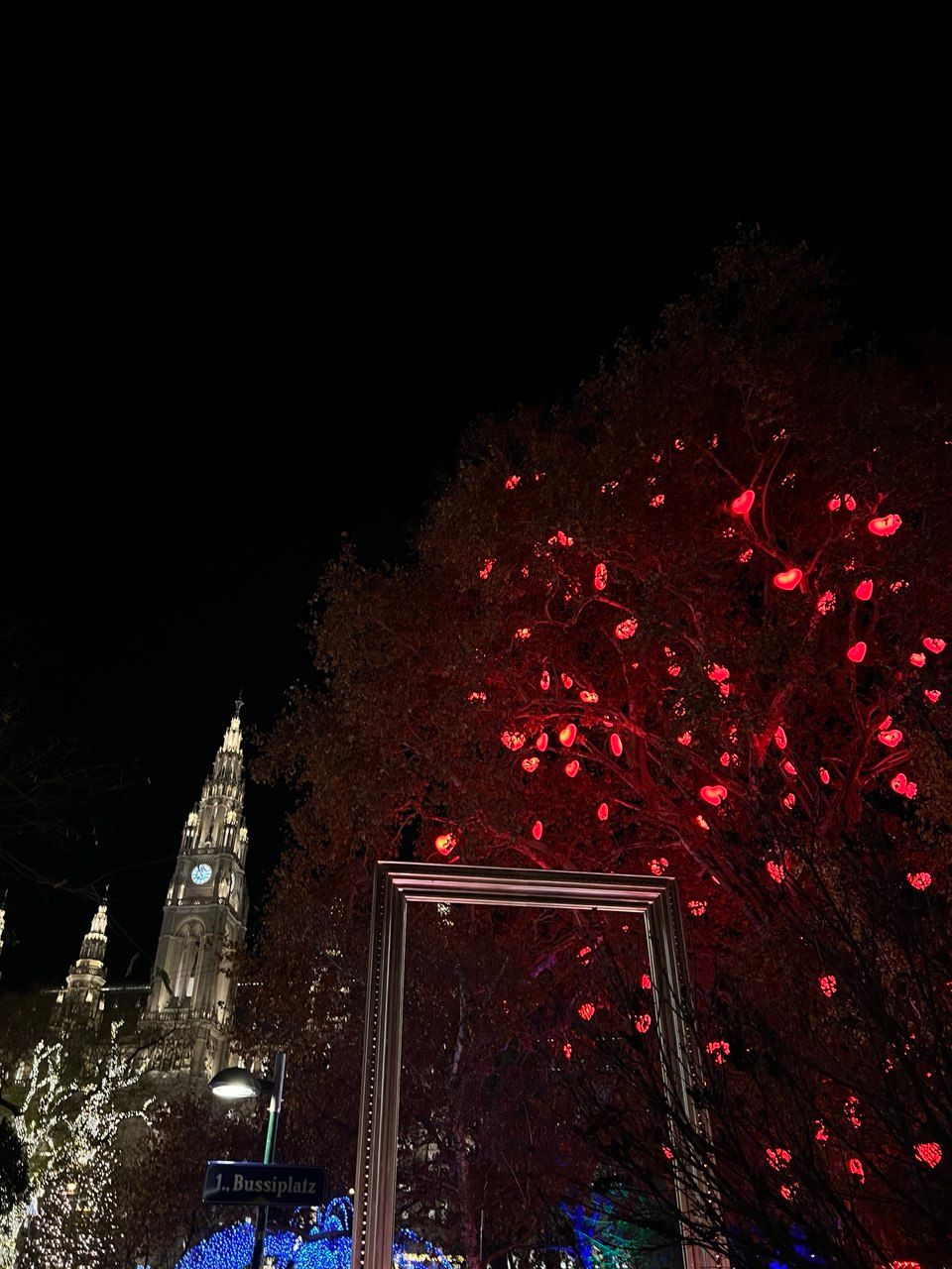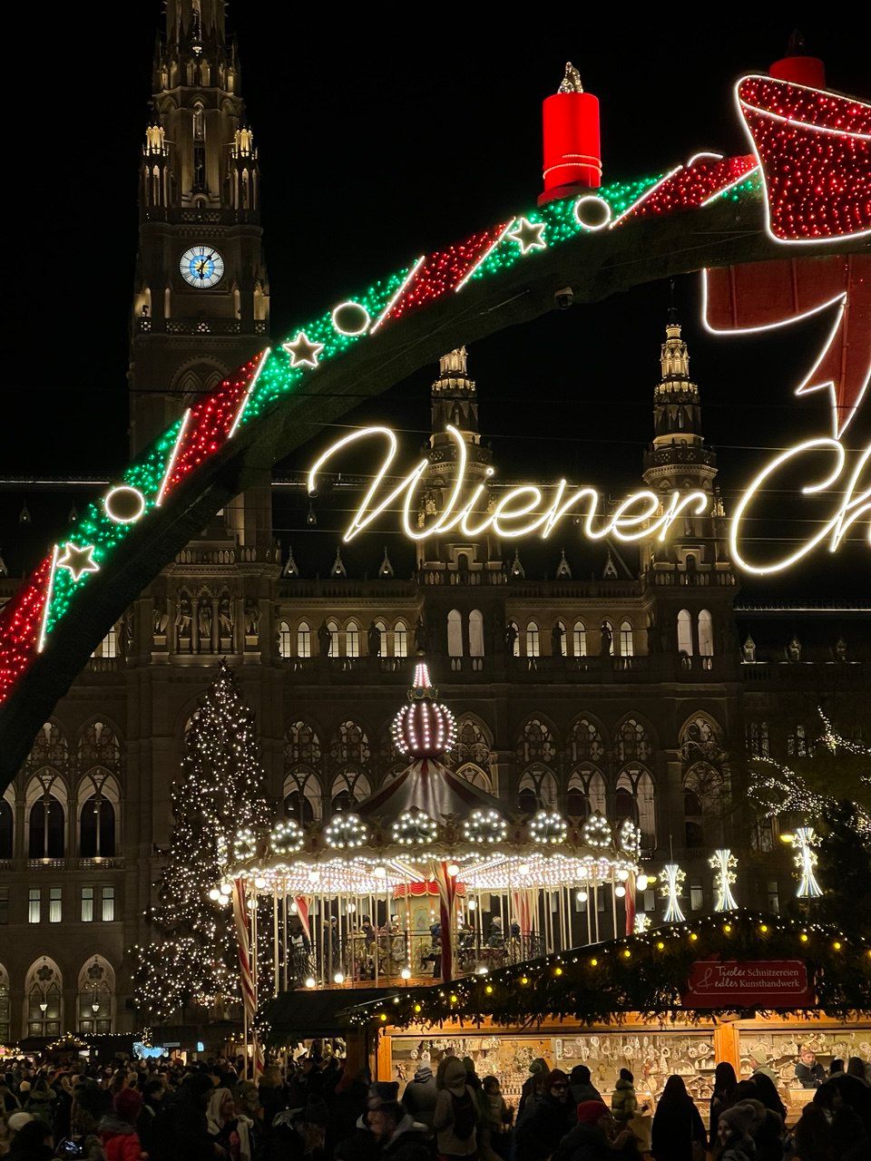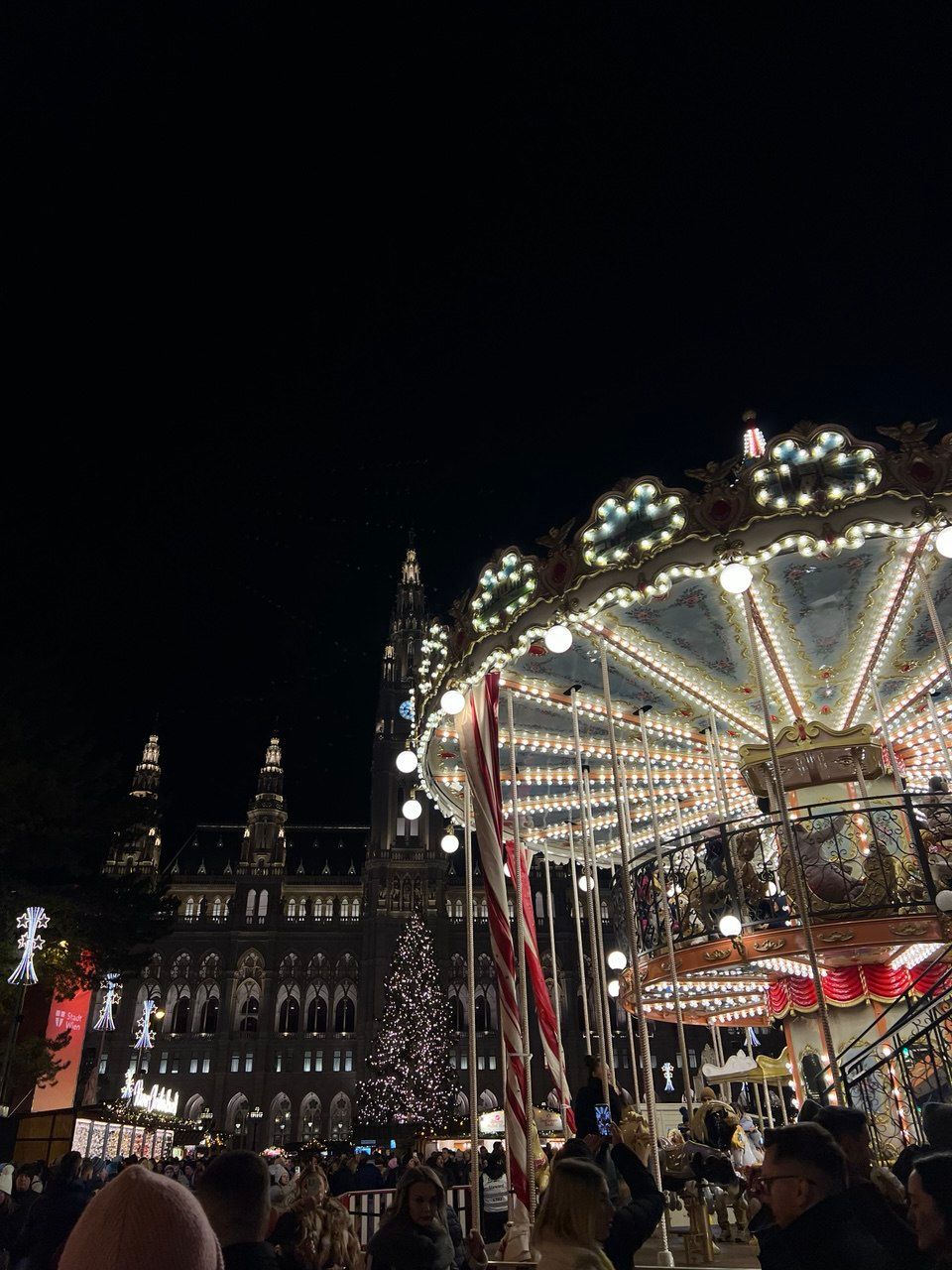 В Вене есть несколько рождественских ярмарок. Самая масштабная и самая яркая расположена возле Ратуши. Здесь есть большой каток, который вечером красиво подсвечивается, колесо обозрения и другие аттракционы. Ранее это была летняя резиденция Габсбургов, поэтому здесь кажется, как будто пришел в гости к императорам. Заметим, что праздничная локация уже работает.