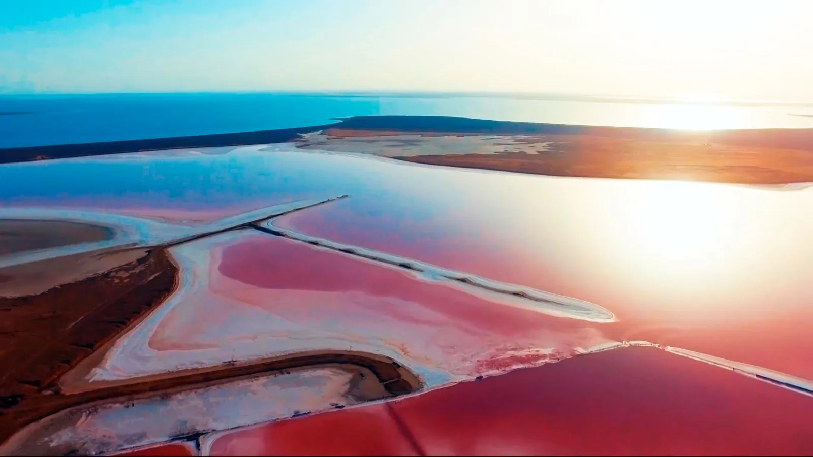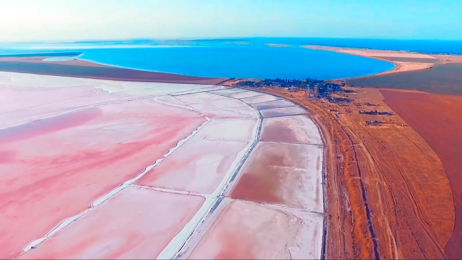 Очередное розовое озеро из системы Сиваш, которое находится на Арабатской стрелке между поселками Геническа и Счастливцево. Пейзажи здесь близки к космическим: на берегах много белой испаренной соли, которая насыщает воздух вокруг озера.