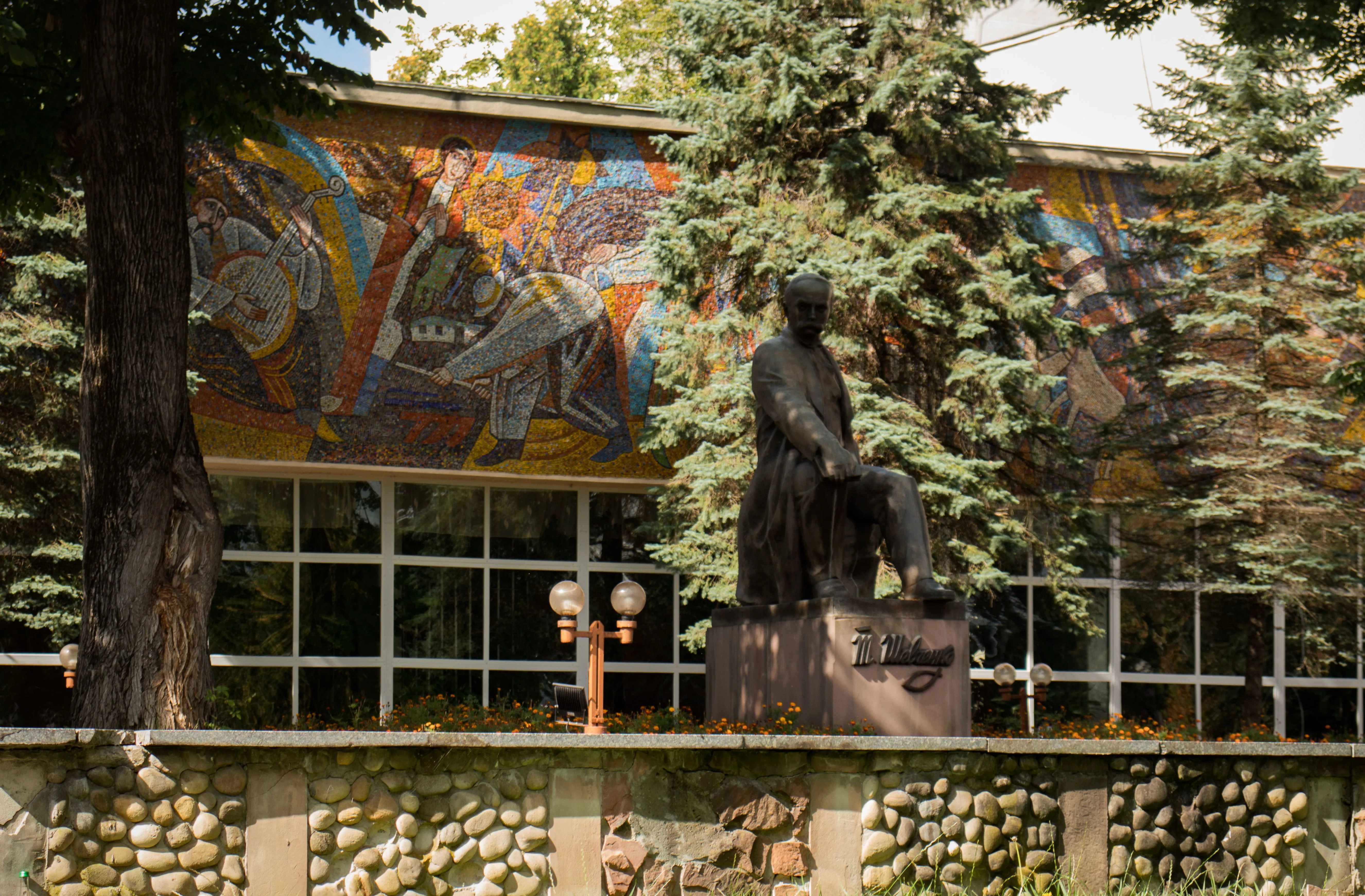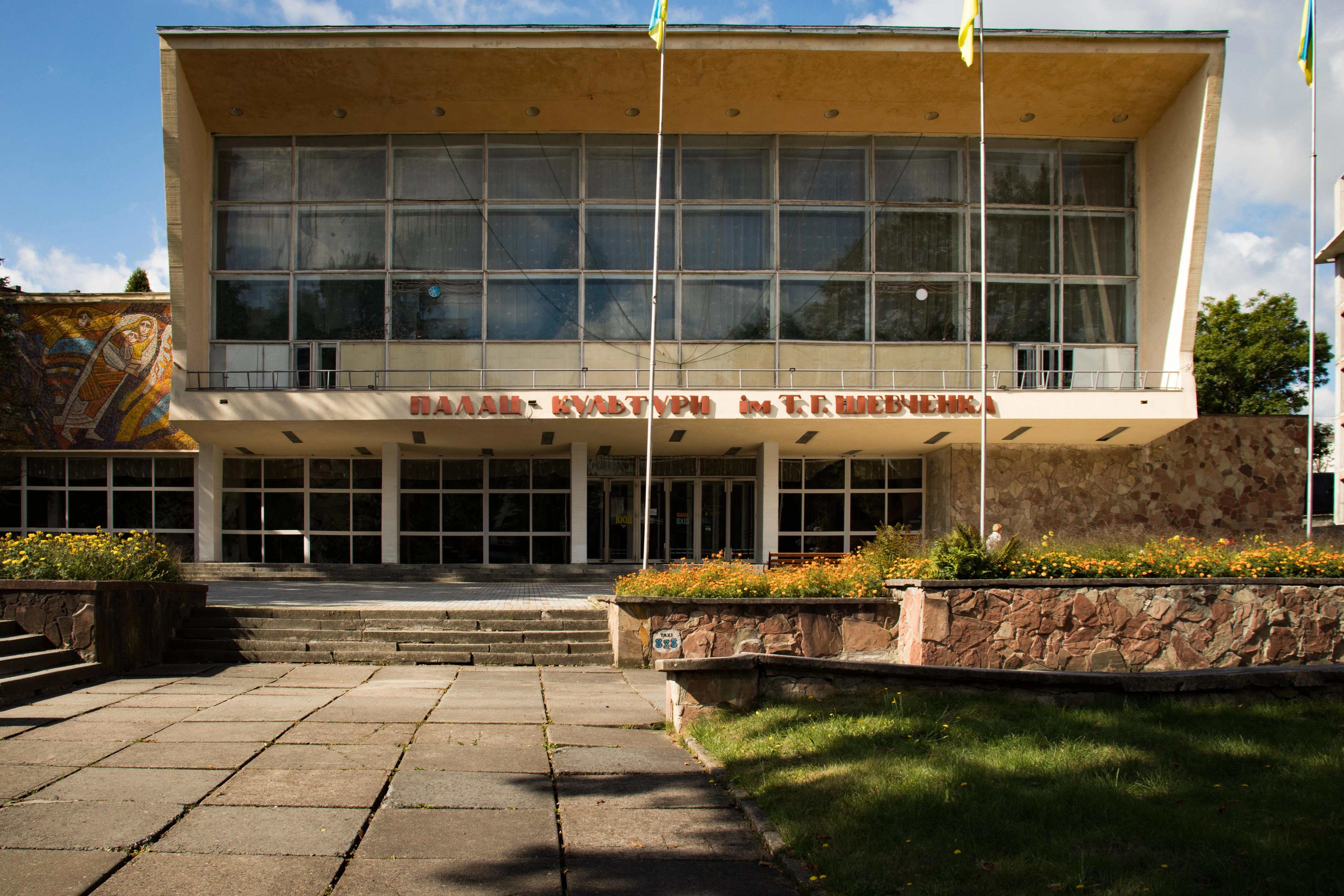 Напротив "Виктории" – дворец культуры имени Тараса Шевченко с советской мозаикой на фасаде. Во времена СССР здесь стояли памятники коммунистическим вождям. Сегодня – монумент Кобзарю.