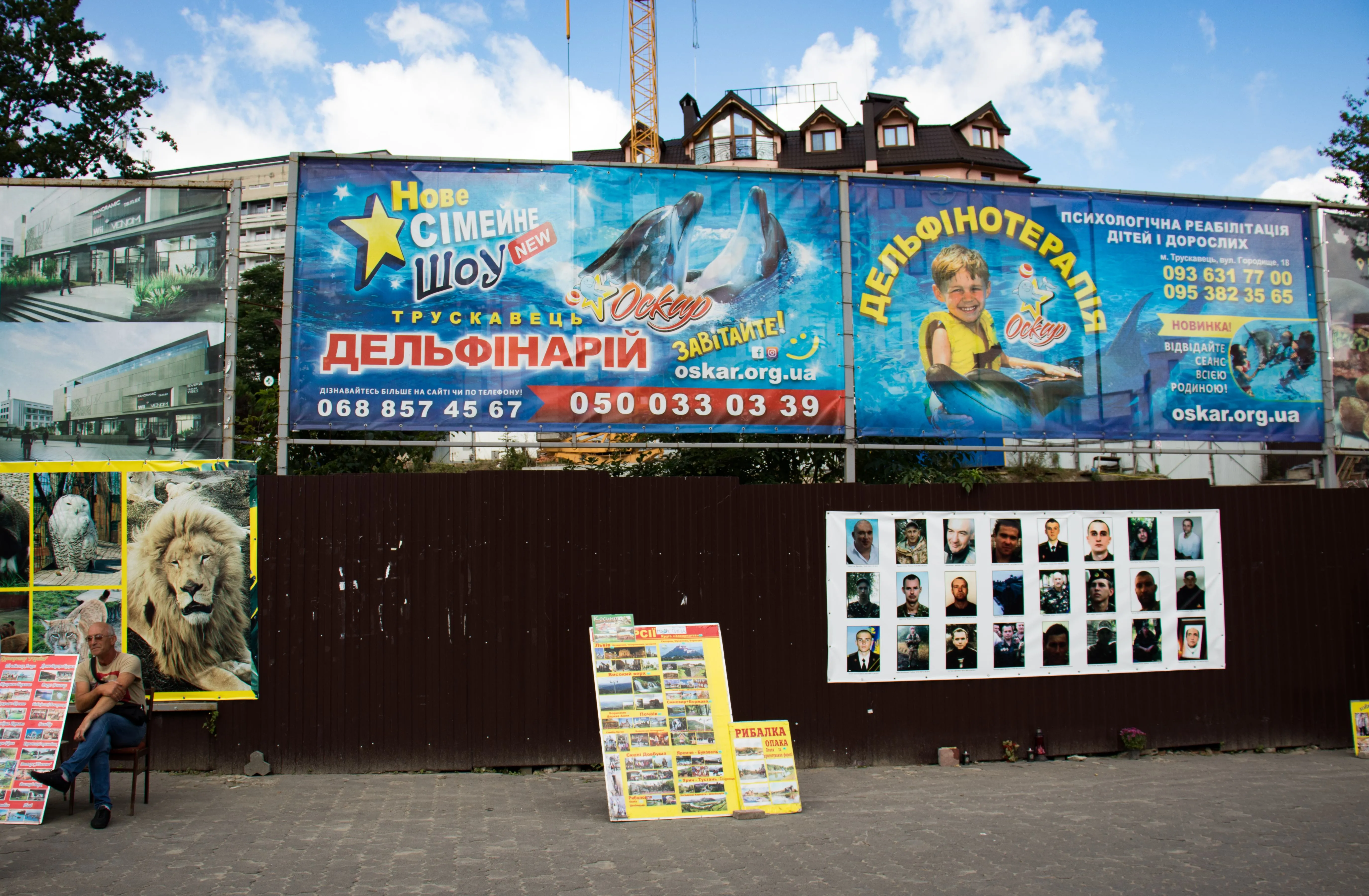 Афиша нового шоу в дельфинарии, ниже – реклама туров и памятная доска с портретами героев Небесной сотни / Фото Светлана Попова, 24 канал