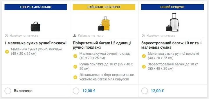 Ryanair пропонує найсуворіші правила щодо перевезення ручної поклажі з-поміж усіх лоукостерів. За правилами авіакомпанії, пасажири можуть взяти одну невеличку сумку безкоштовно. Якщо ви оплатите послугу Priority, ви також зможете пронести на борт велику ручну поклажу.