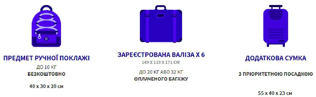 Дозволений розмір безкоштовної ручної поклажі: 55х40х20 сантиметрів.