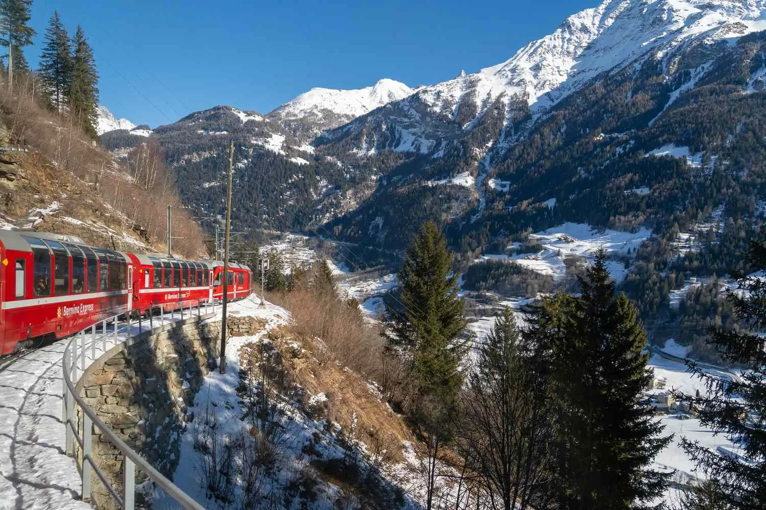 Червоний потяг, що курсує в бік до Церматта / Фото Travel + Leisure