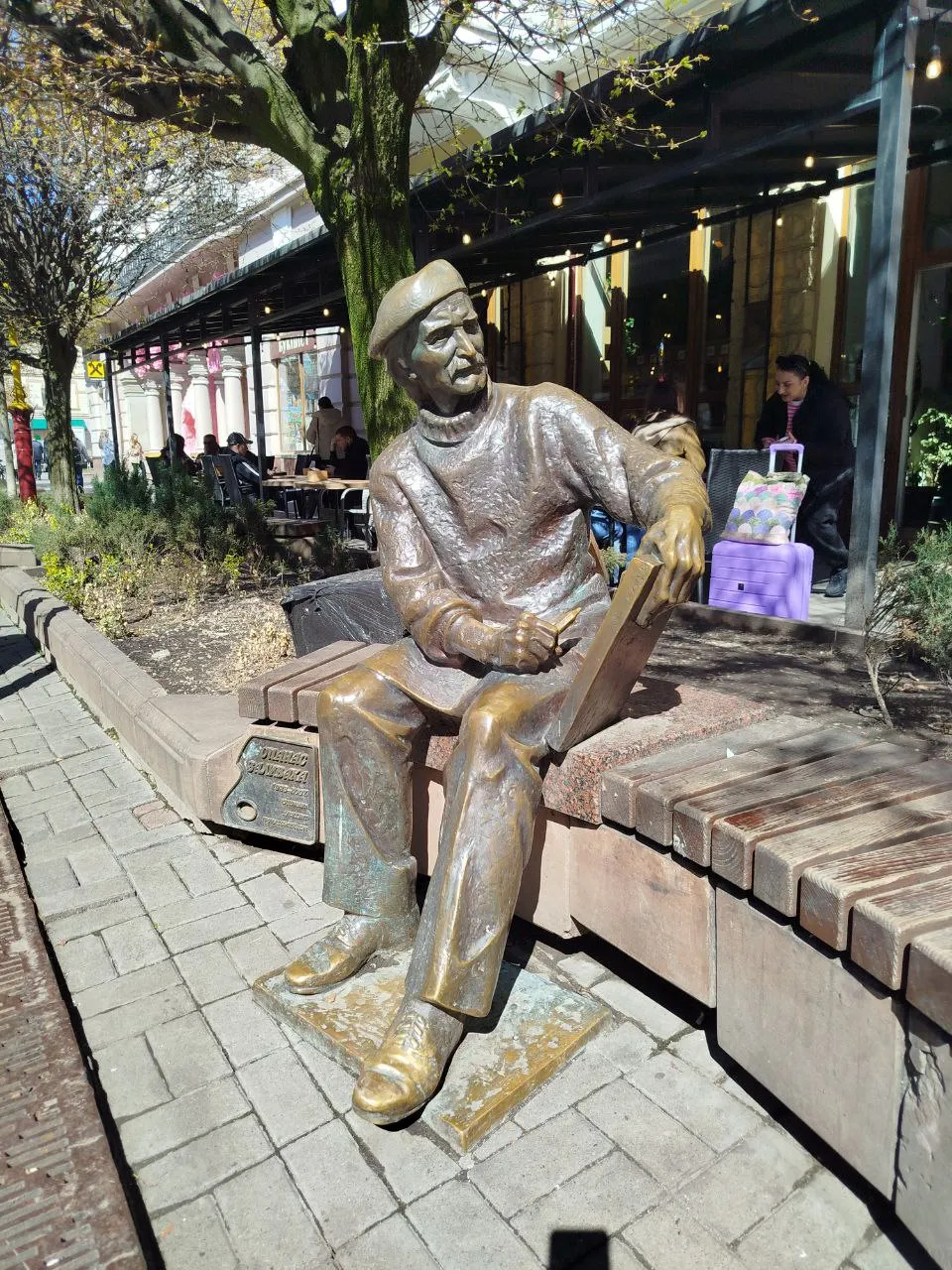 На вулиці розкидані різноманітні пам'ятники, як от Опанасу Заливаці, біля якого можна посидіти на лавочці.