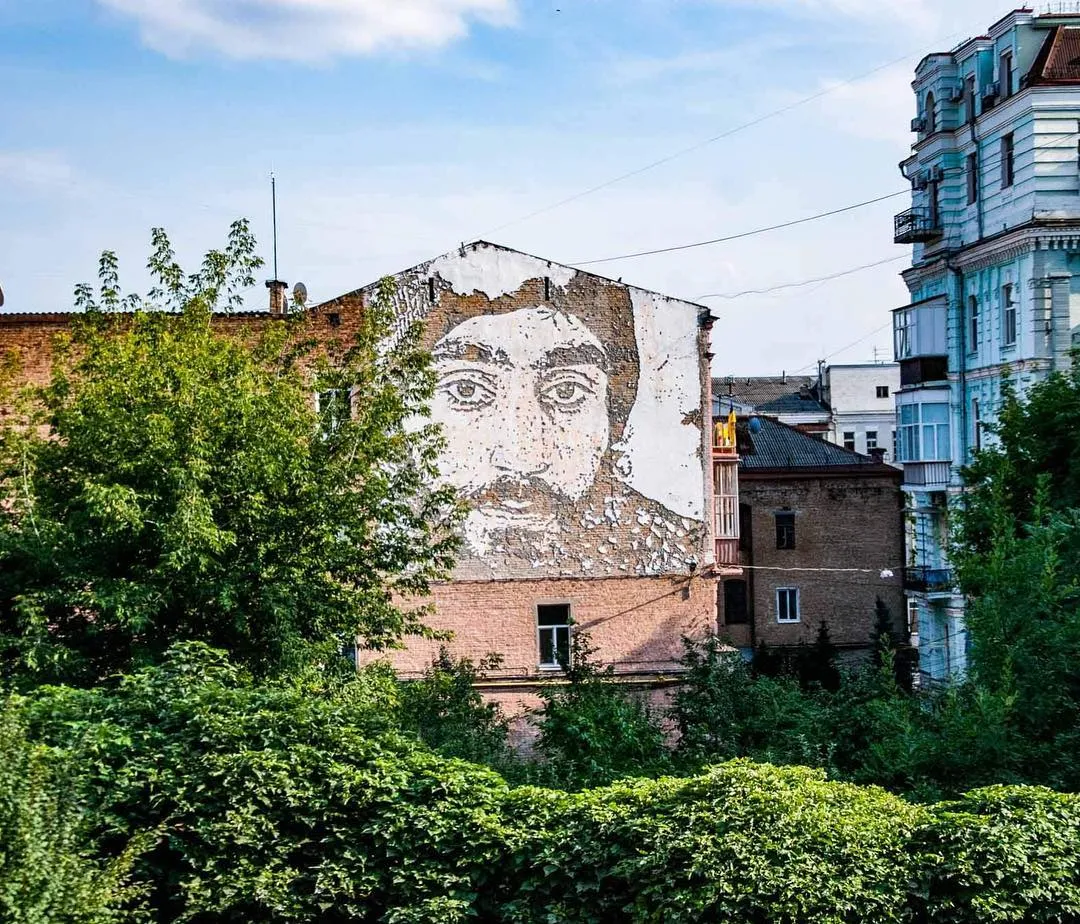 Портрет з'явився на стіні будинку у центрі Києва влітку 2015 року. Автор – португальський художник Олександр Фарто ("Vhils"). Його графіті особливе тим, що не намальоване, а викарбуване. Замість фарби митець використовує будівельні інструменти, якими знімає шари старої штукатурки, оголюючи цегляну кладку.