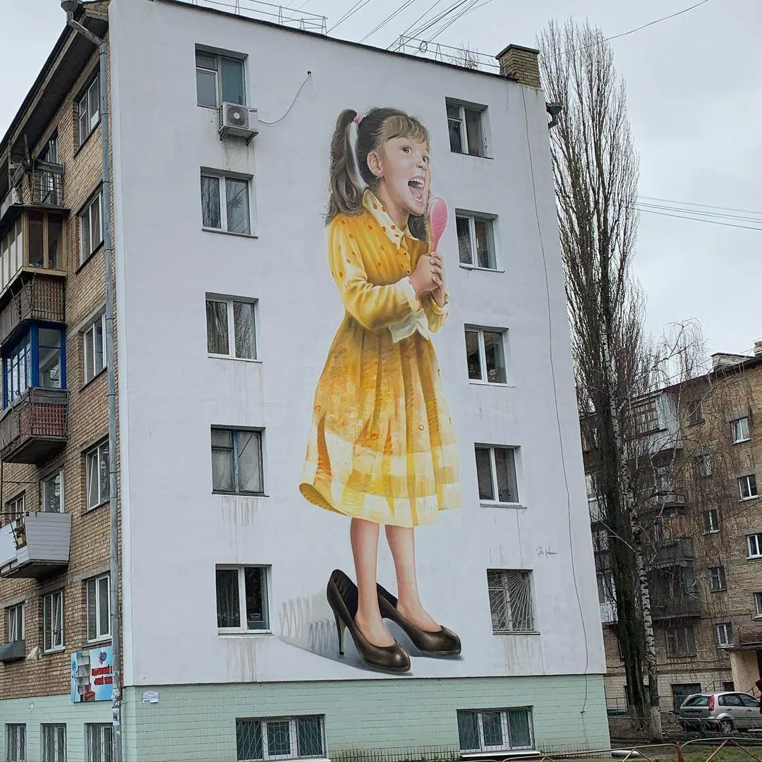 На одній з п'ятиповерхівок Києва малеча співає у гребінець, примірявши на себе завеликі мамині туфлі. Автором муралу є український художник з Донбасу – Олександр Корбан.