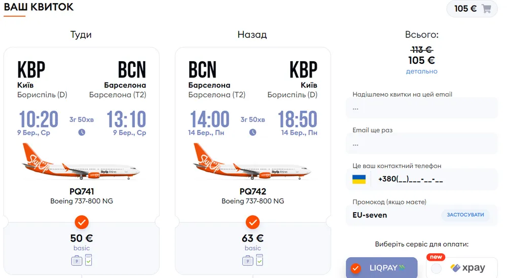 Приклад бронювання квитків Київ – Барселона – Київ зі знижкою:
