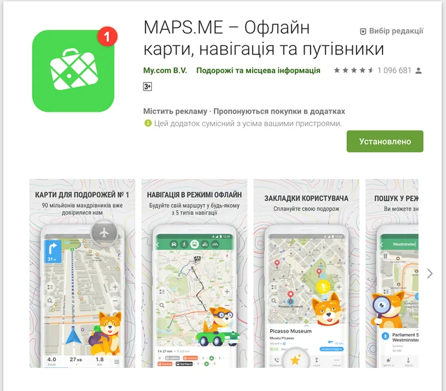 Це один з найнеобхідніших додатків. Головне завдання – попередньо завантажити карти та поставити позначки тих місць, які хочете відвідати. Також тут є готові маршрут, ними можна ходити та вивчати незнайомі місцини.