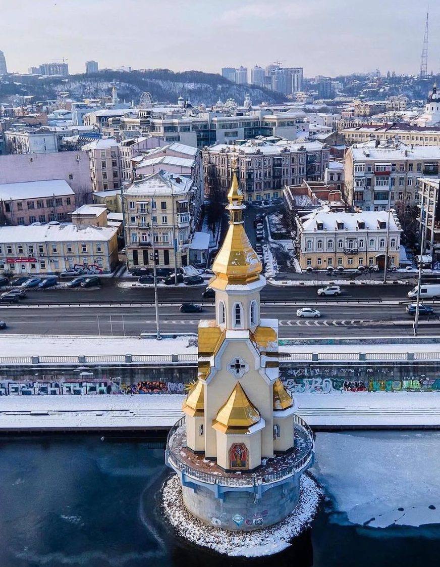 Над річкою Дніпро у Києві стоїть унікальний храм – Святого Миколая Чудотворця. Невелика за розмірами церква стоїть на бетонній платформі просто посеред води. Оригінальний храм відзначається елегантною архітектурою з золотим куполом та світлими фасадами. Церкву збудували у 2004 році, і від тоді вона стала улюбленим місцем киян для весільних фотосесій.