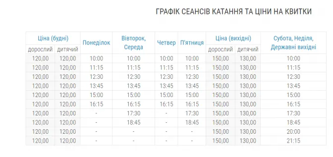 Вартість квитка для дорослих у будні – 100 гривень та 120 гривень на вихідних, а для дітей 80 гривень у будні та 100 на вихідних – за 45 хвилин катання.