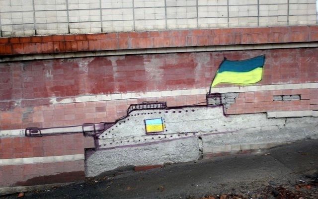 Тут майстерно змалювали український танк на місці, де відсутня будівельна плитка.