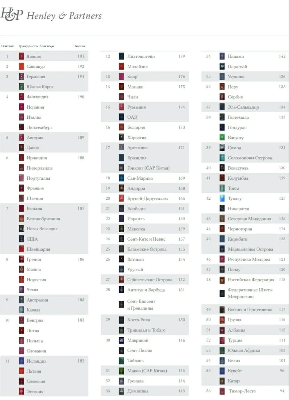 Індекс паспортів Henley & Partners аналізує візові правила 227 країн і територій світу і ранжирує їх за кількістю країн безвізового в'їзду.