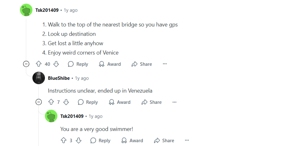 Коли я 15 хвилин намагалася визначити правильний поворот до мого мініготелю, я вирішила загуглити, що тут і до чого. З'ясувалося, що користувачі Reddit також обговорювали цей нюанс венеційського вояжу – і, здається, знайшли цікаве рішення.