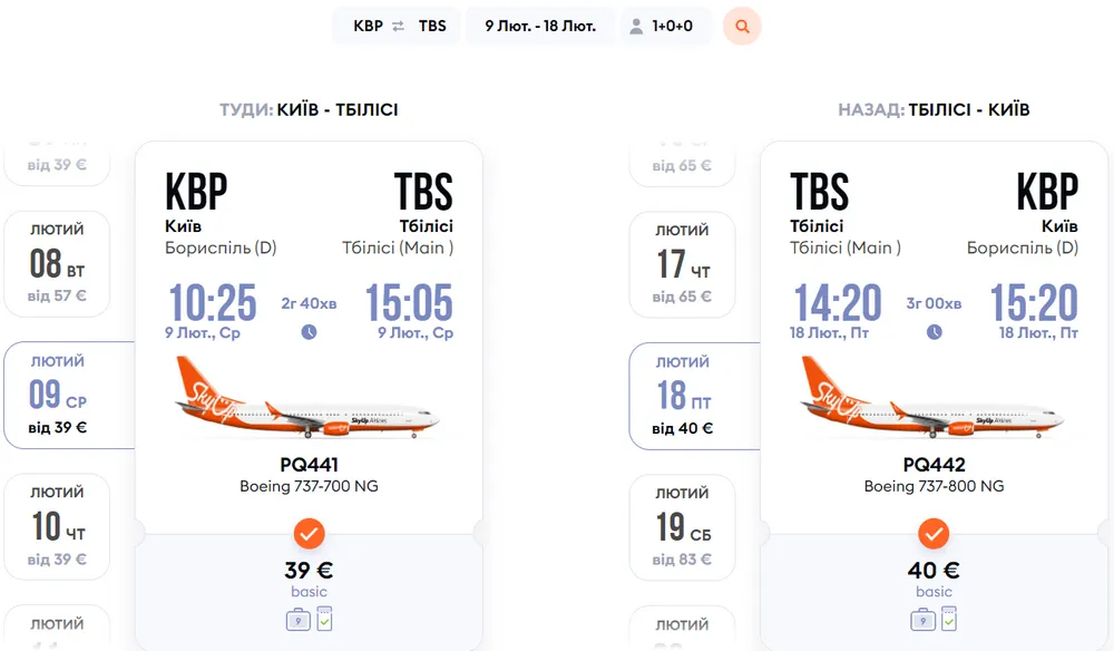 Так, авіаквитки з Києва до Тбілісі можна придбати за ціною від 39 євро (1 199 гривень) в один бік та від 79 євро (2 413 гривень) в обидва. Дешеві квитки є на різні дати в січні – грудні 2022 року.