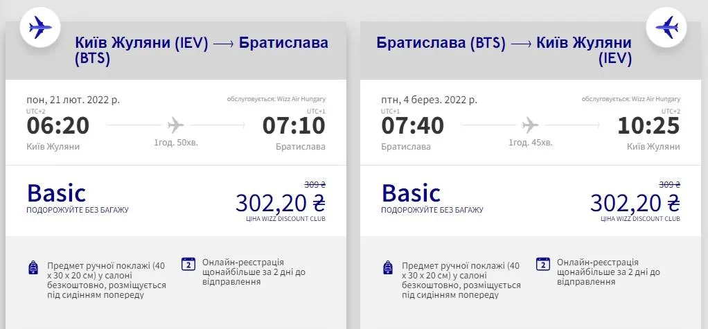 - Київ – Братислава – Київ (21.02.2022 – 04.03.2022) – 20 євро.