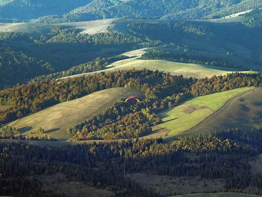 На мальовничому кадрі – самотній параплан, який злітає над альпійськими луками гірського масиву Боржава в Українських Карпатах.